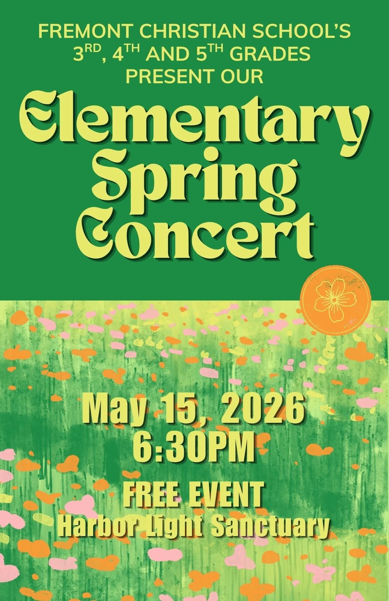 Fremont Christian School Elementary Spring Concert Friday, May 15, 2026 6:30 PM 7:30 PM 18:30 19:30 Harbor Light Church 4760 Thornton Avenue Fremont, CA, 94536 United States (map) Google Calendar ICS